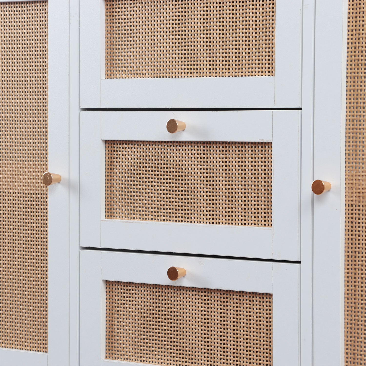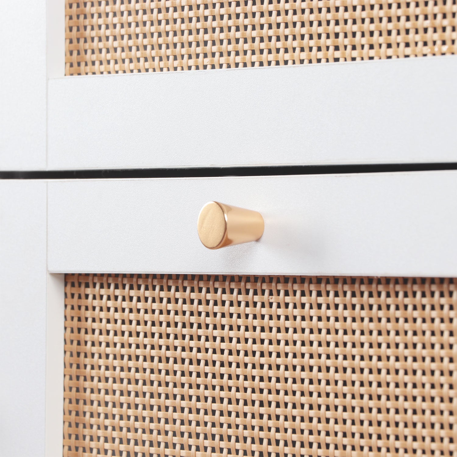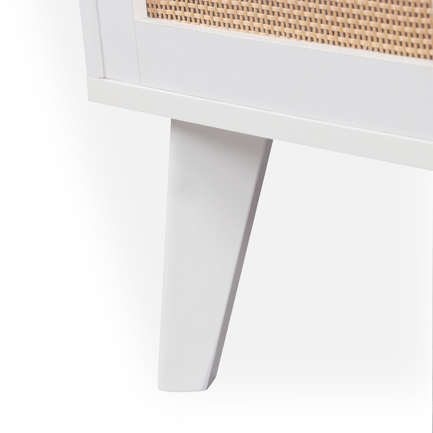 Son design se distingue par trois tiroirs et deux portes ornées d'une façade en cannage, intégrée dans un cadre en bois blanc, avec des poignées en finition or rose qui ajoutent une touche moderne. Ce meubles charmant rehaussera votre espace de vie ou votre chambre à coucher avec une note chic et naturelle. Optez pour la collection Carnes pour un intérieur stylé !