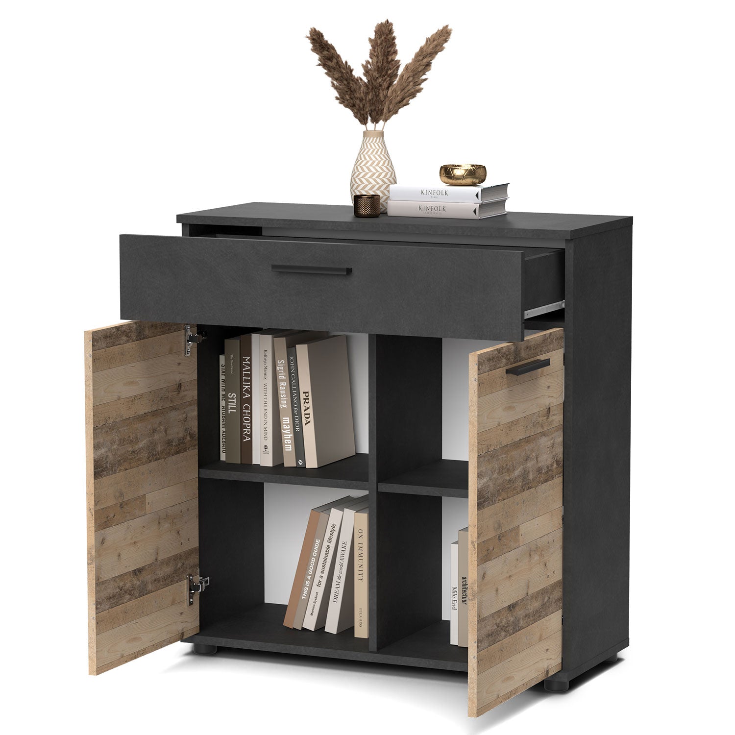 Ouverture du rangement : Porte et tiroir