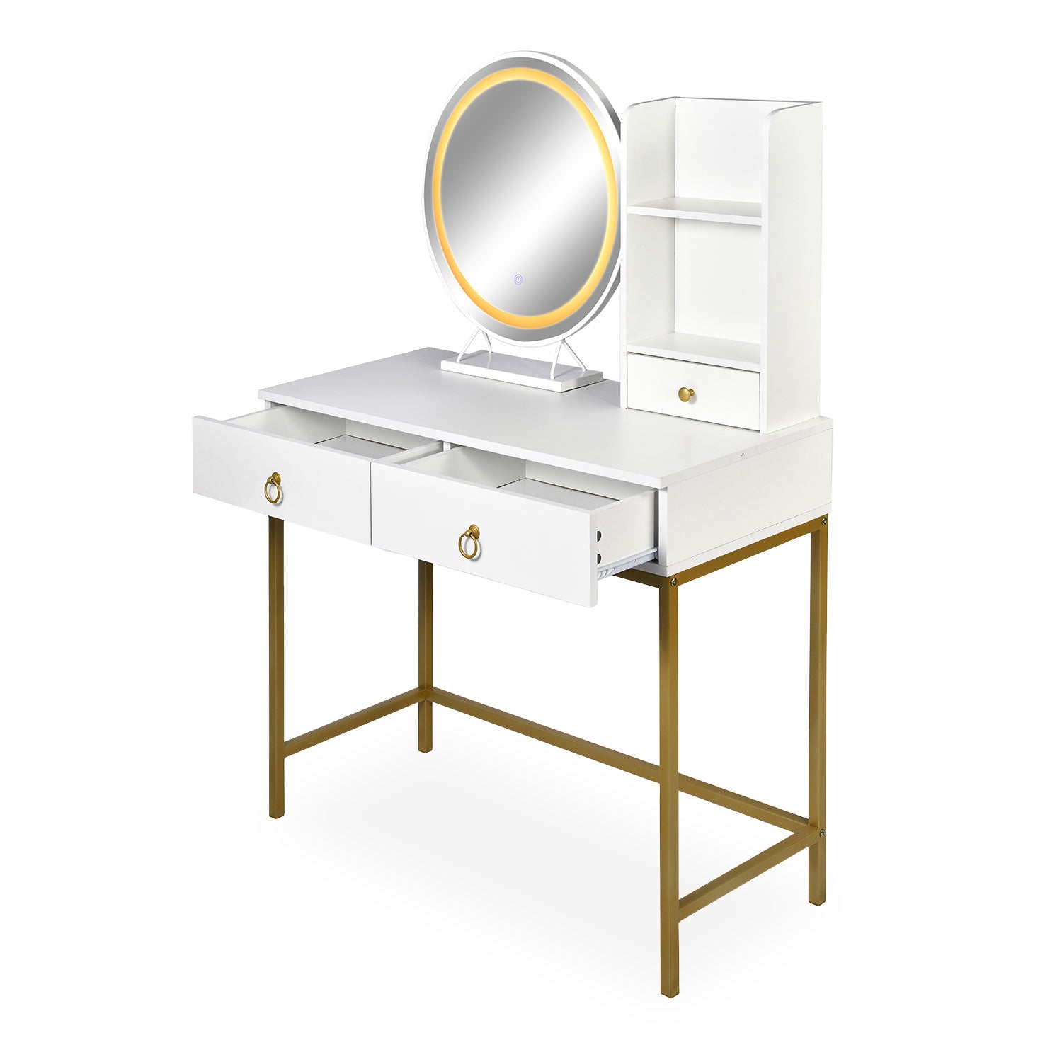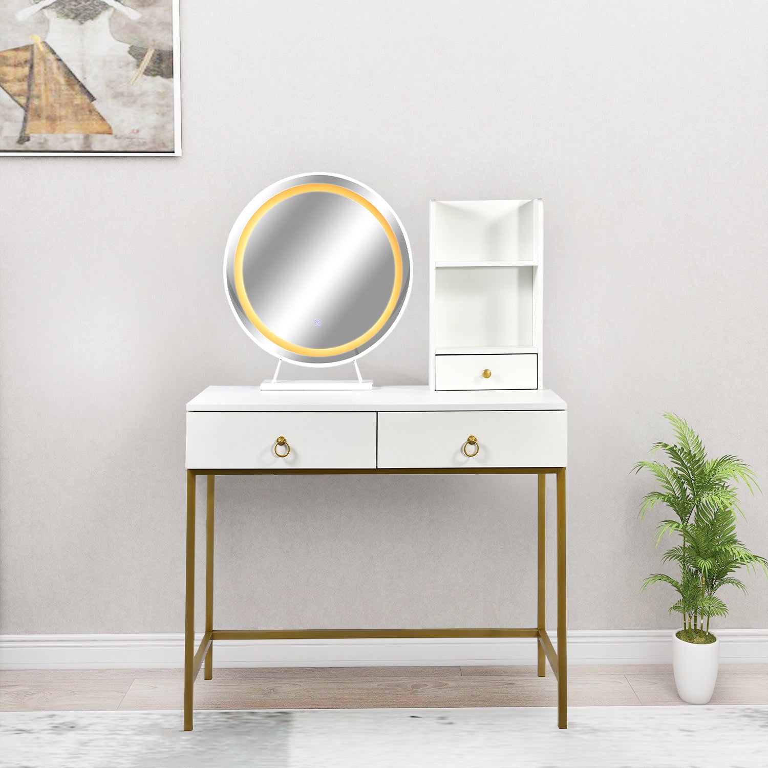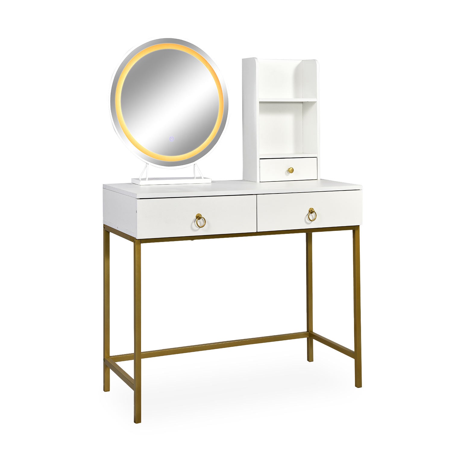 Coiffeuse avec miroir rond lumineux Cezaria 90 cm blanc et or