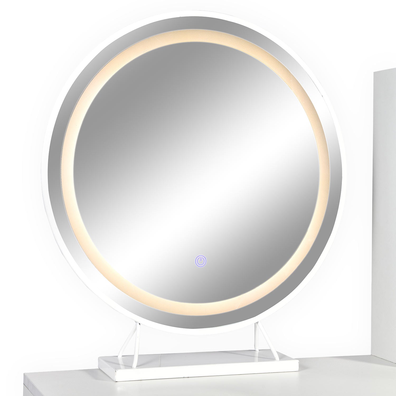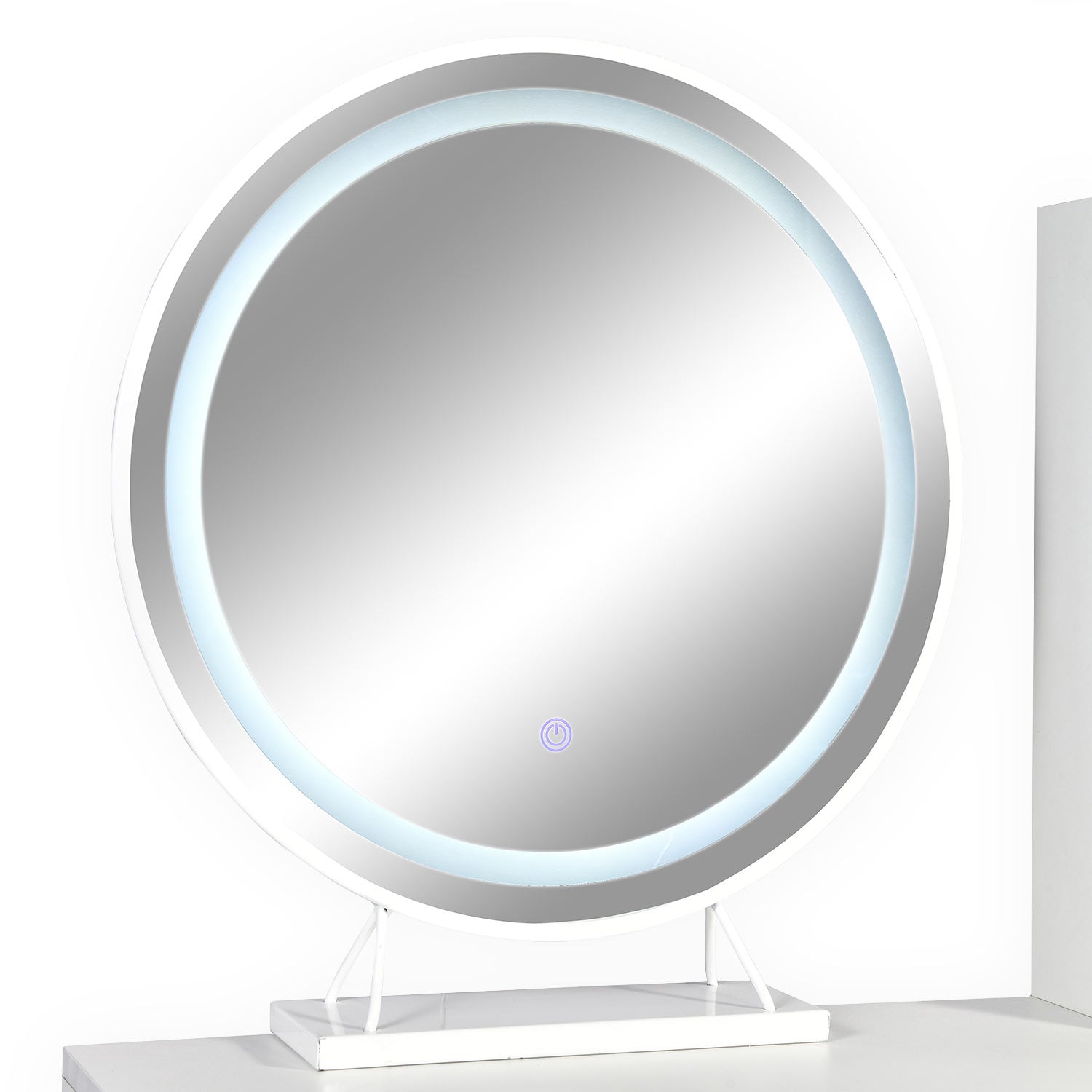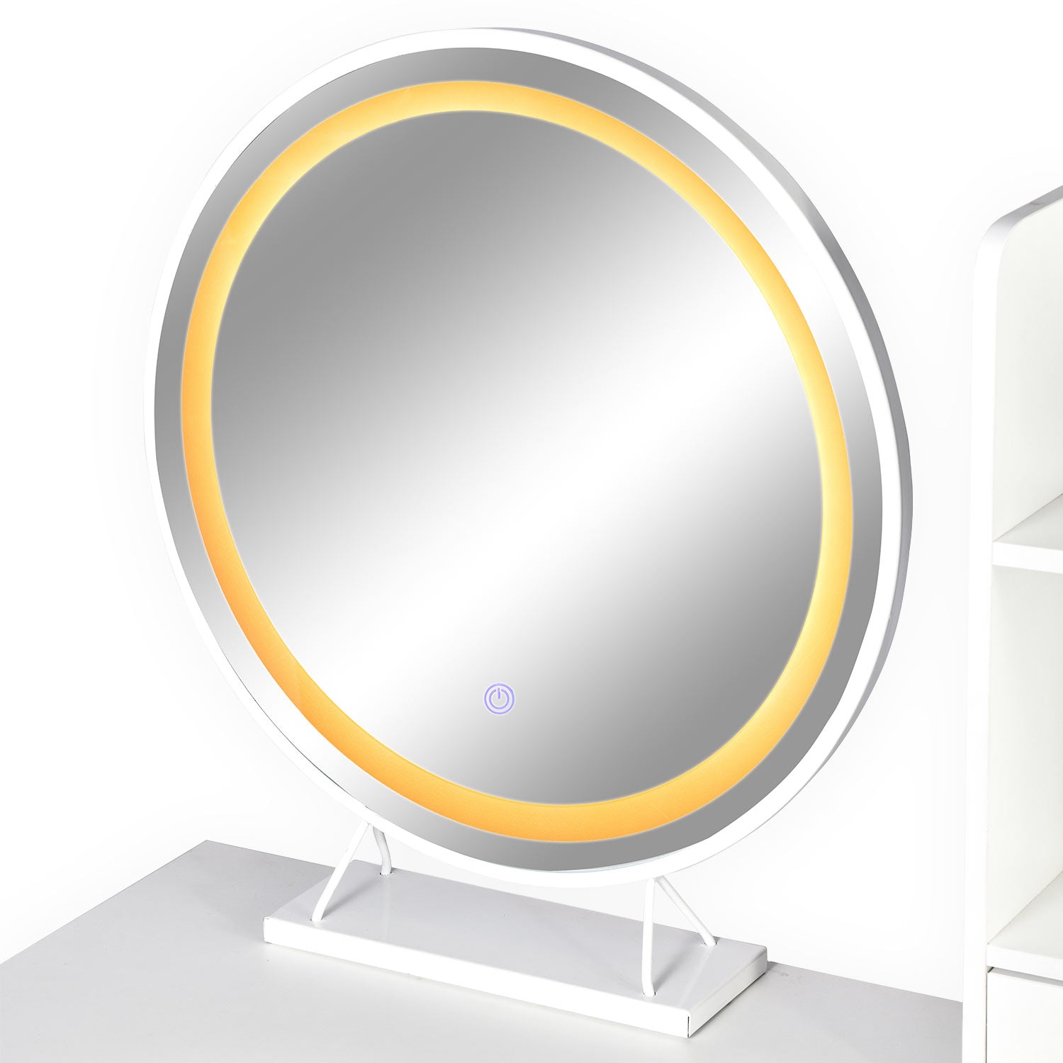 Coiffeuse avec miroir rond lumineux Cezaria 90 cm blanc et or