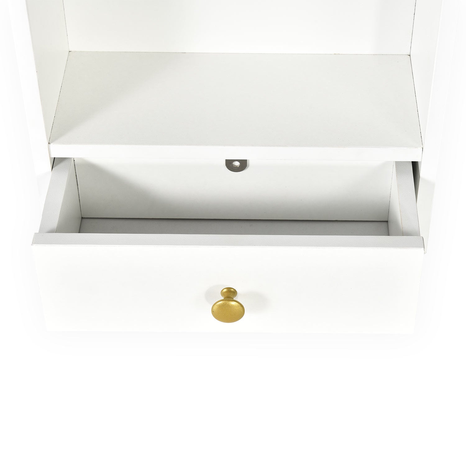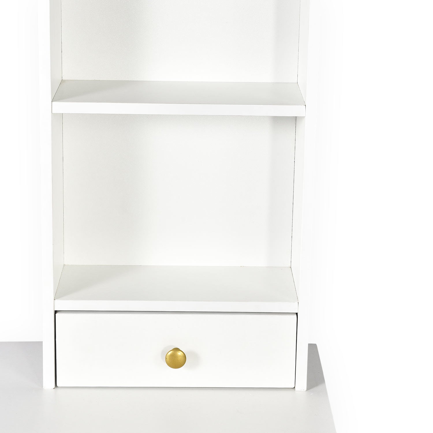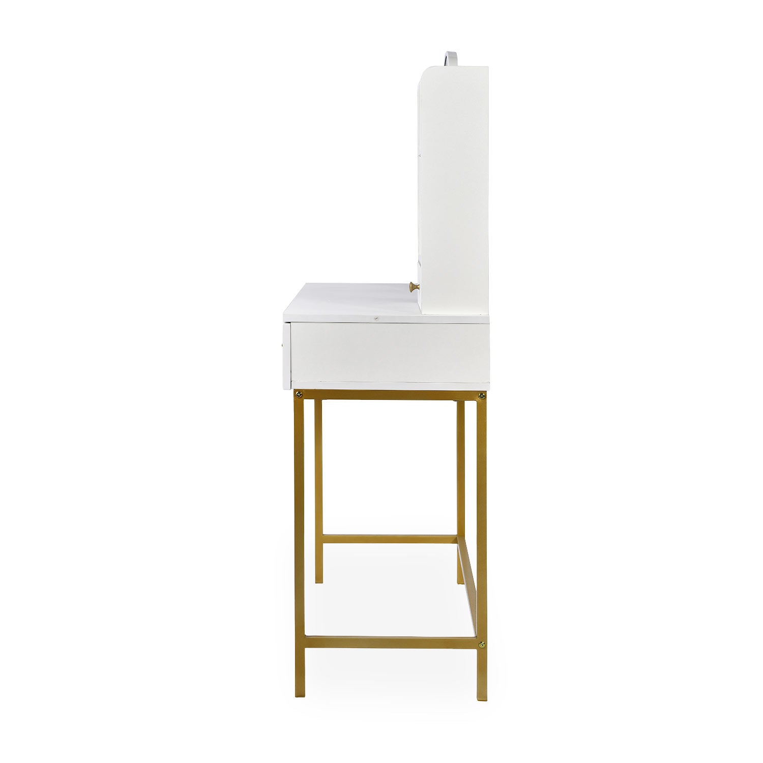 Avec ses trois tiroirs et étagères, la coiffeuse Cezaria offre des rangements astucieux pour garder vos essentiels à portée de main et votre espace bien ordonné. Le piètement en métal doré et sa structure blanche apportent une touche moderne à tous les styles d'intérieur. Un incontournable pour une routine beauté alliant organisation et charme !