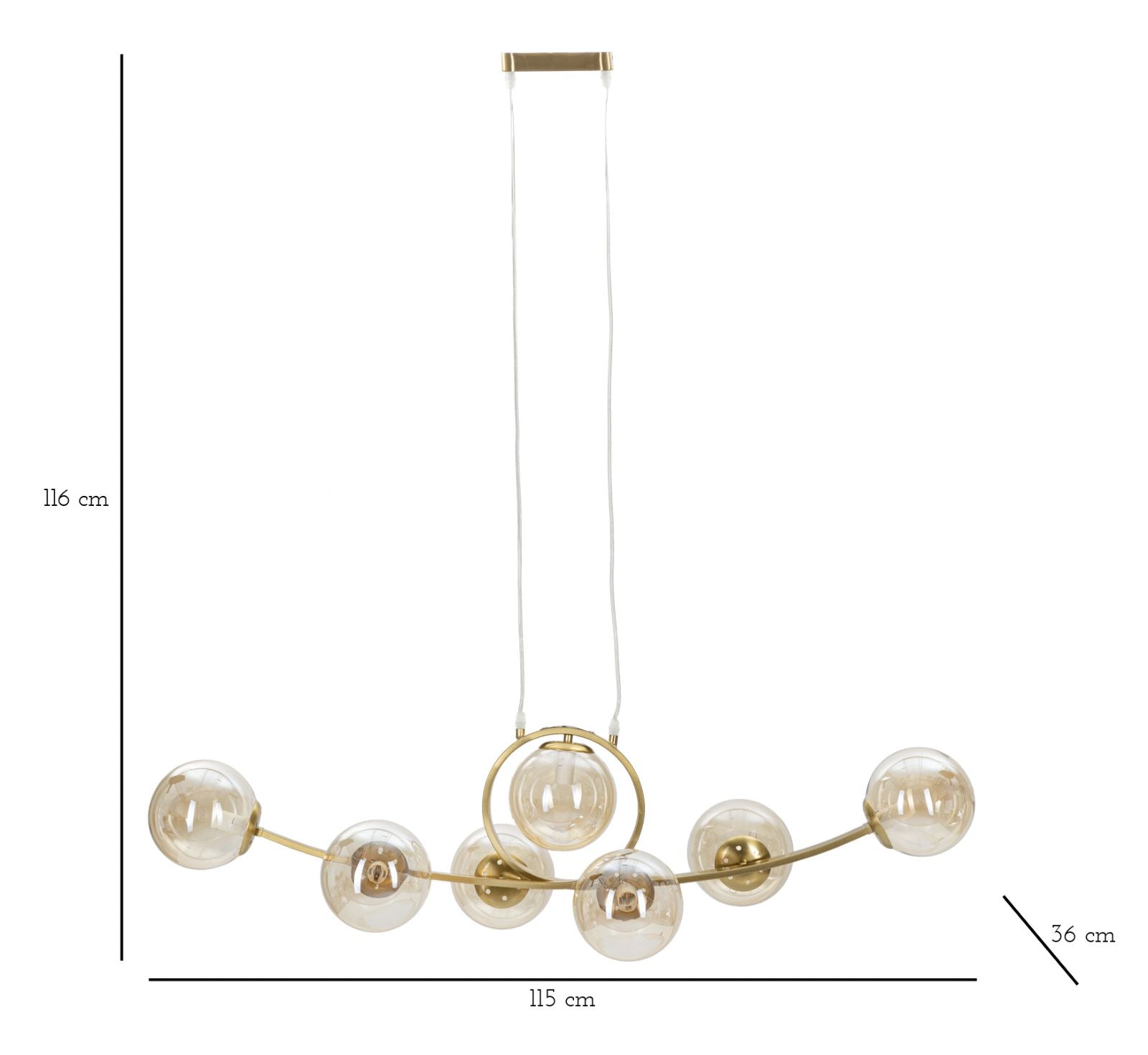 Lampe de plafond en métal doré aux lignes essentielles avec 7 points lumineux dans des sphères élégantes en verre blanc.