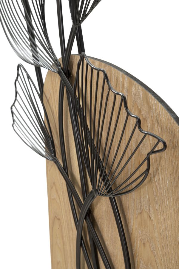 Panneau mural décoratif 3D en métal et bois avec formes abstraites et feuilles élégantes