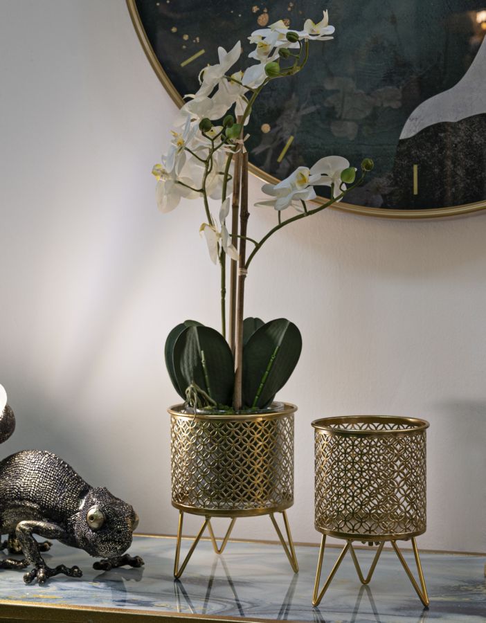 Apportez une touche de sophistication à votre espace avec cette élégante paire de porte-vases en métal doré. Chaque pièce est ornée de délicates sculptures rondes entrecroisées, ajoutant une dimension artistique et raffinée. Le support, également en métal doré, assure une stabilité et une élégance accrues. Les pots, facilement amovibles, vous permettent de varier les arrangements floraux selon vos envies. Idéals pour embellir votre bibliothèque ou vos étagères, ces supports pour plantes allient fonctionnalité et esthétique de manière harmonieuse, le tout dans un matériau en fer durable. Faites de votre intérieur un lieu chic et accueillant grâce à ces accessoires uniques.