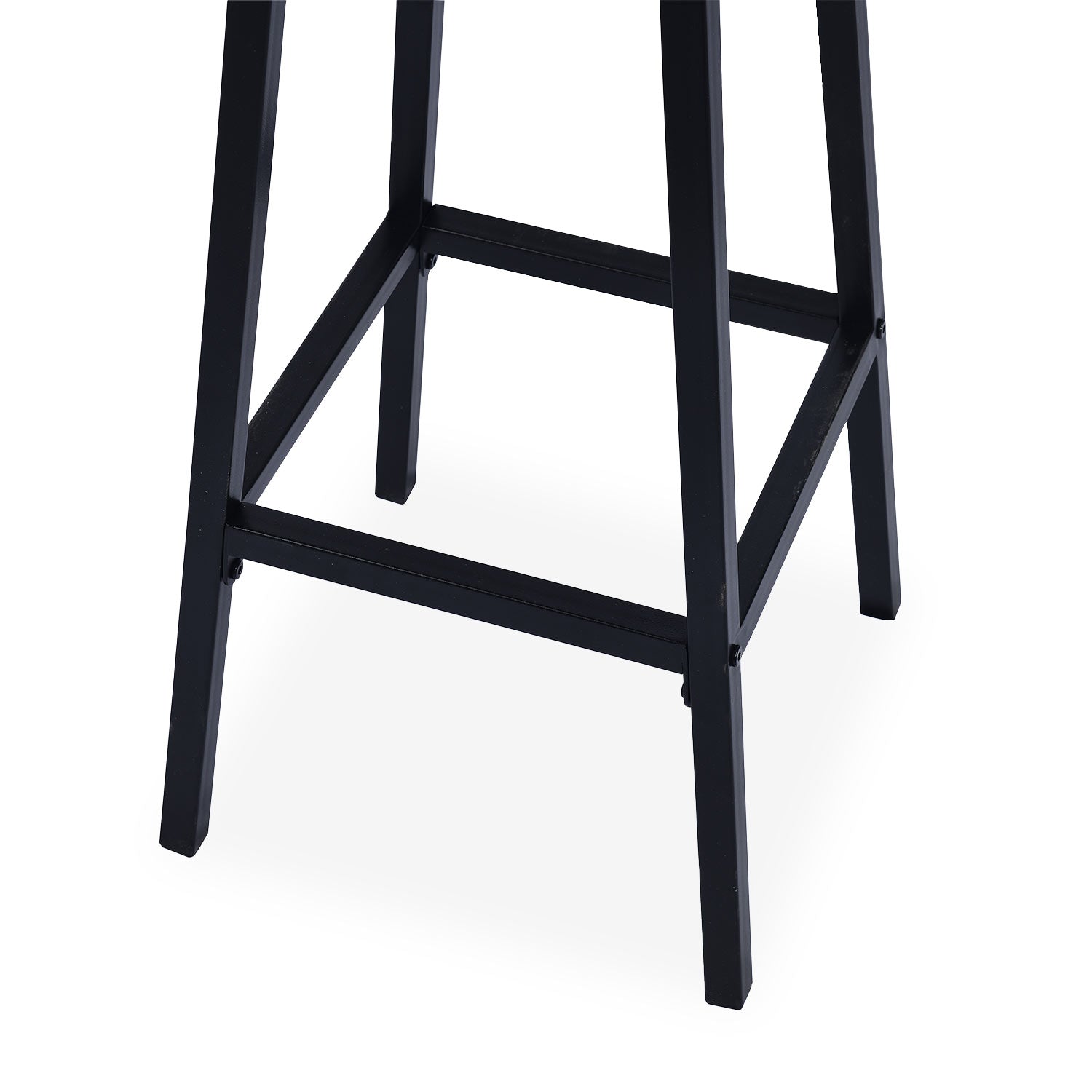 Les deux tabourets de 67 cm de hauteur se glissent harmonieusement sous la table, optimisant l'espace. Leur assise en M.D.F avec impression bois rustique et leur structure en métal noir assurent confort et stabilité.