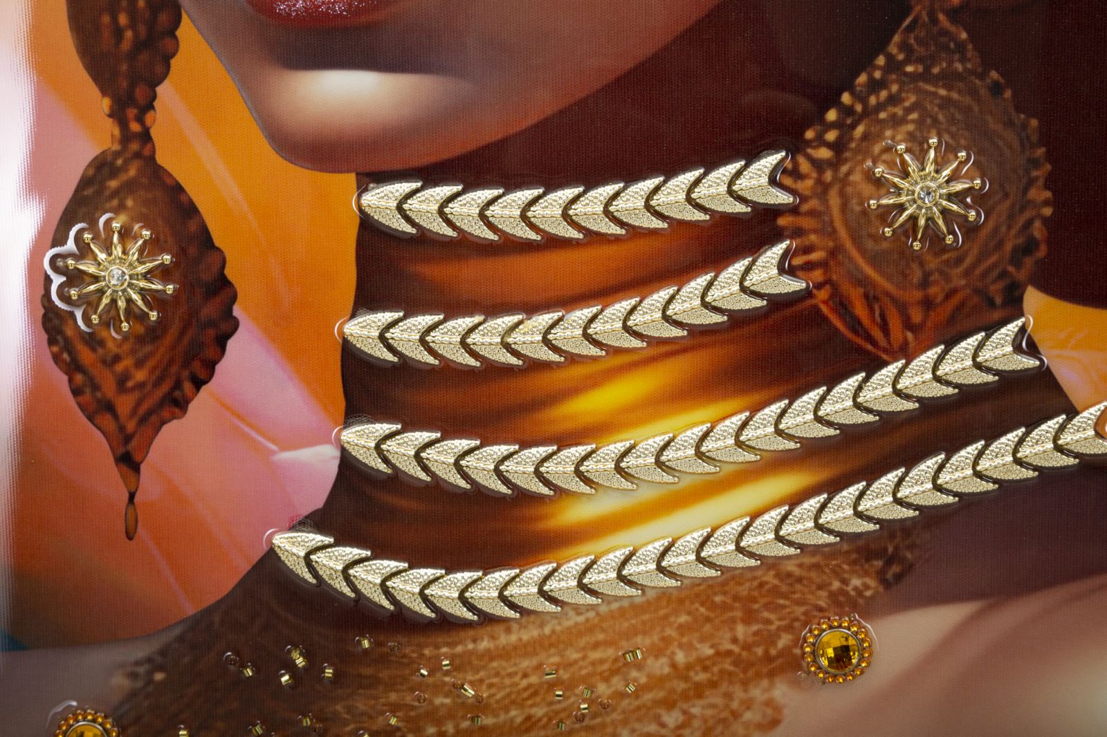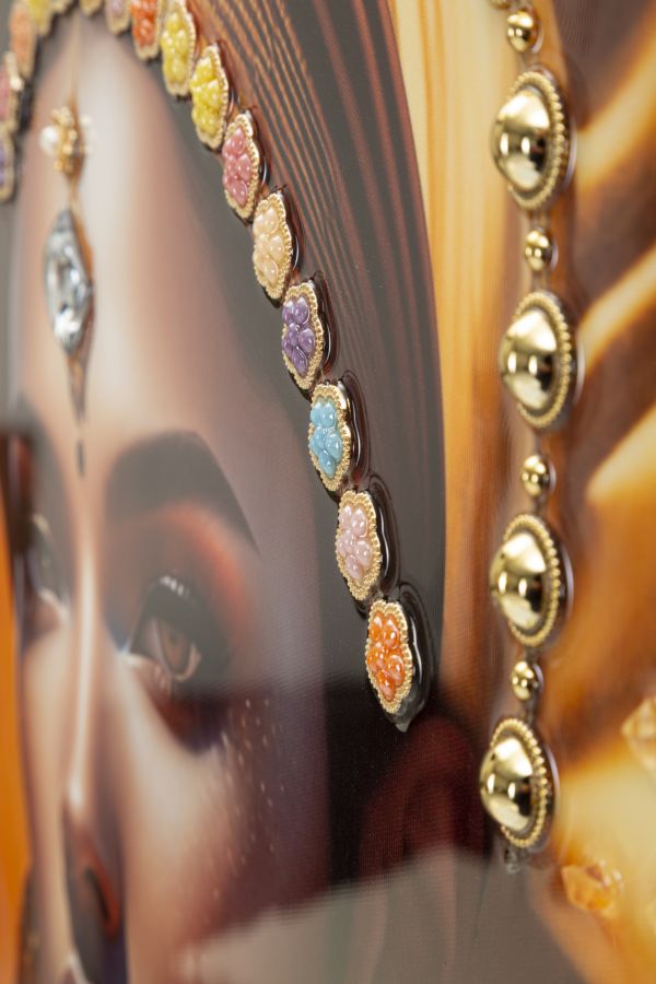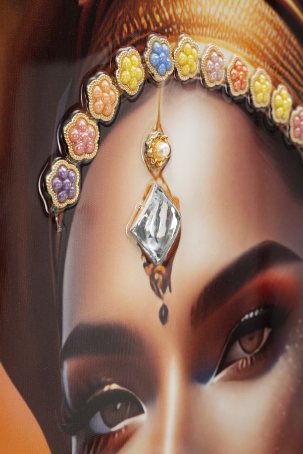 Cette magnifique peinture sur toile capture l'élégance d'une femme en habit traditionnel, ornée d'un turban somptueux. Le tableau est superbement encadré dans un cadre en bois massif, renforçant ainsi son aspect chaleureux et authentique. Pour un fini encore plus raffiné, celui-ci est complété par un cadre métallique doré, ajoutant une touche de sophistication à l'ensemble. Avec ses couleurs multicolores et vibrantes, cette œuvre d'art devient un élément central de toute décoration murale, parfaite pour apporter une atmosphère accueillante et culturelle à votre intérieur. Que ce soit dans un salon, une chambre ou un espace de travail, ce tableau est idéal pour sublimer vos murs tout en racontant une histoire captivante.